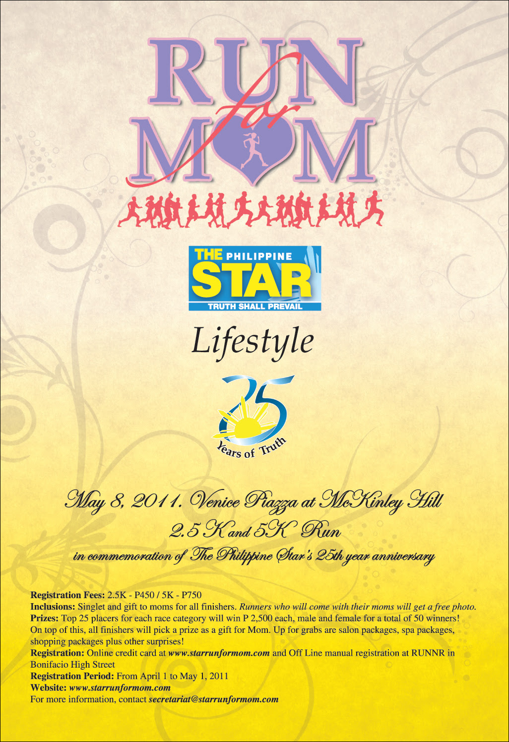 Here's a way to celebrate Mother's Day this coming May 8. Join the The Philippine Star Run For Mom. It will be held at Venice Piazza @ Mckinley Hill. You may register for the 2.5K and 5K, this run also also celebrates the Star's 25th year anniversary.